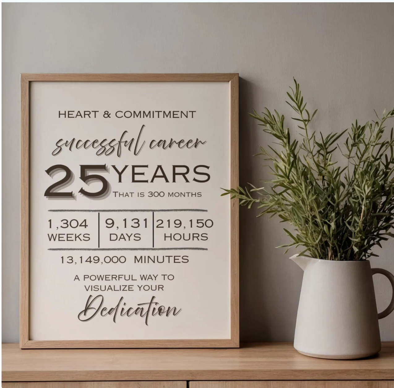 This sign was designed to celebrate something that often goes unspoken—the magnitude of a 25-year career. I wanted to create a keepsake that didn’t just say “congrats,” but actually showed the time, dedication, and commitment behind the milestone.