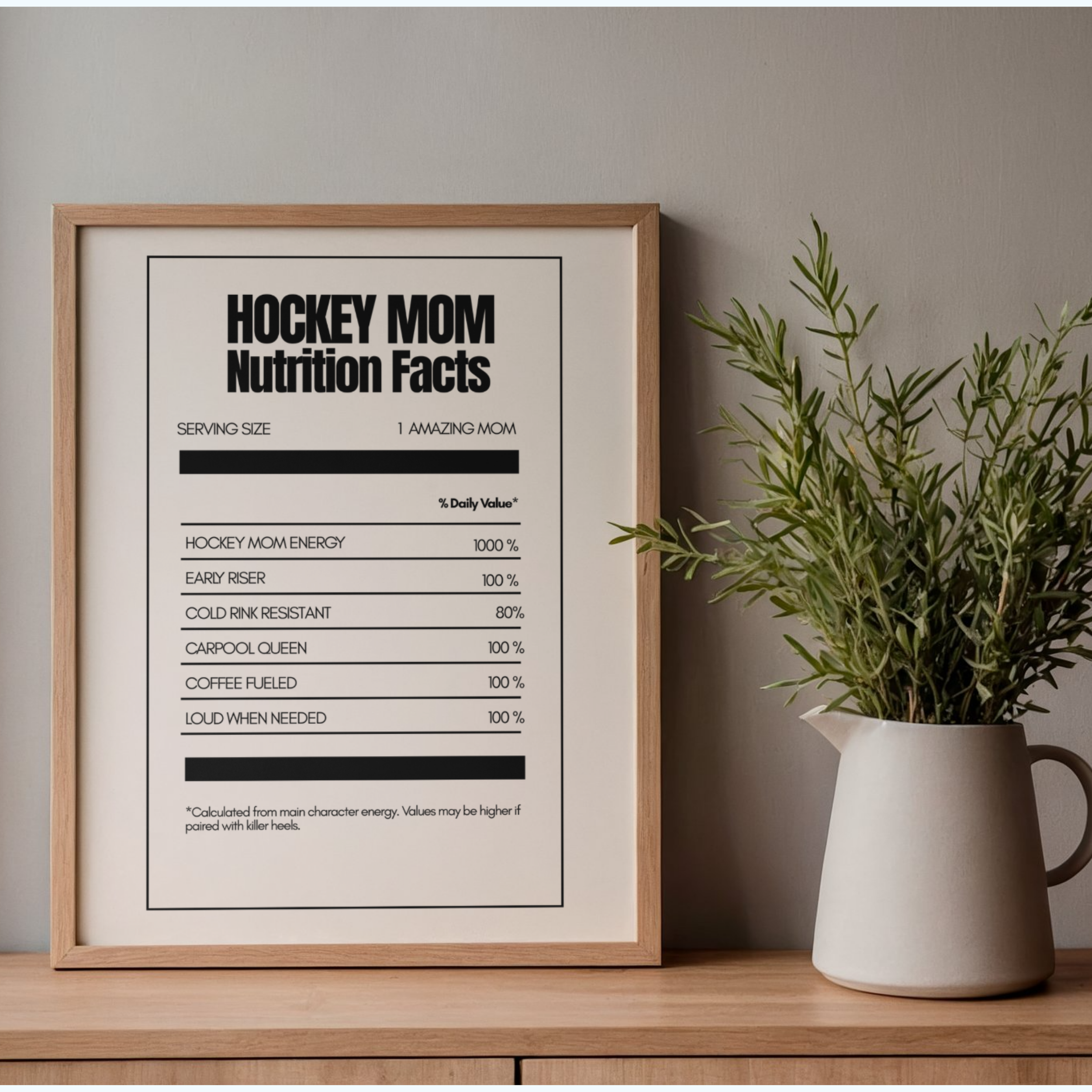 I created the Hockey Mom Nutrition Facts design because I wanted something that felt true. Something funny, heartfelt, and instantly recognizable to anyone who’s lived rink-side life. Inspired by the classic nutrition label, this design breaks down what really fuels a hockey mom—patience, resilience, humor, and unconditional support (with a heavy dose of coffee).