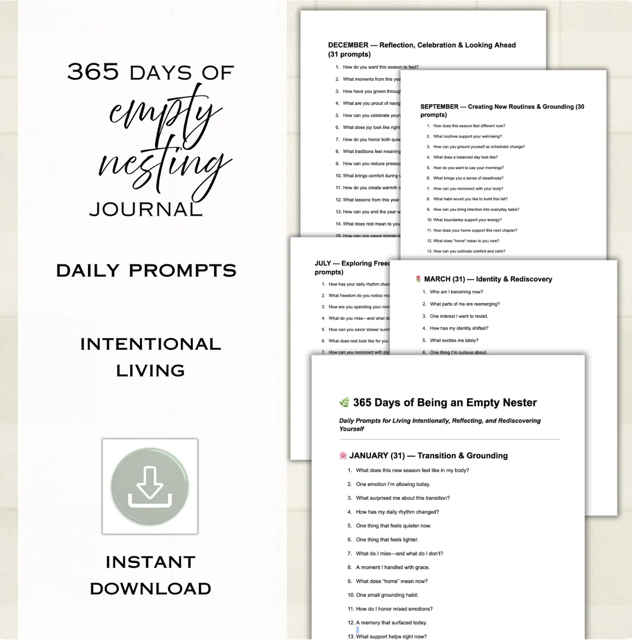 That’s what led me to create the Empty Nester Journal Prompt Kit. I designed it as a supportive, pressure-free tool to help reflect on the past, honor the present, and thoughtfully explore what’s next. The prompts are simple, encouraging, and meant to be taken at your own pace—no right answers, just honest reflection.