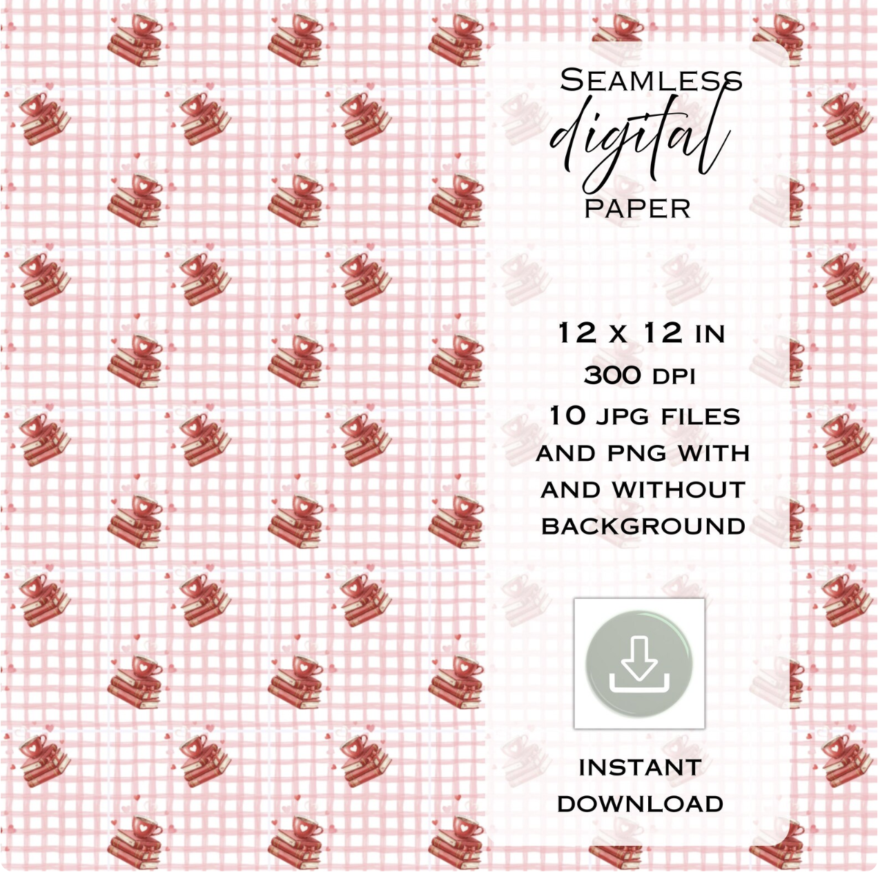 I’ve been loving the process of designing seamless paper lately—especially patterns that blend bookish charm with cozy Valentine’s Day vibes. This collection started with a simple vision: books, hearts, warm colors, and a soft, on-trend aesthetic readers gravitate toward.