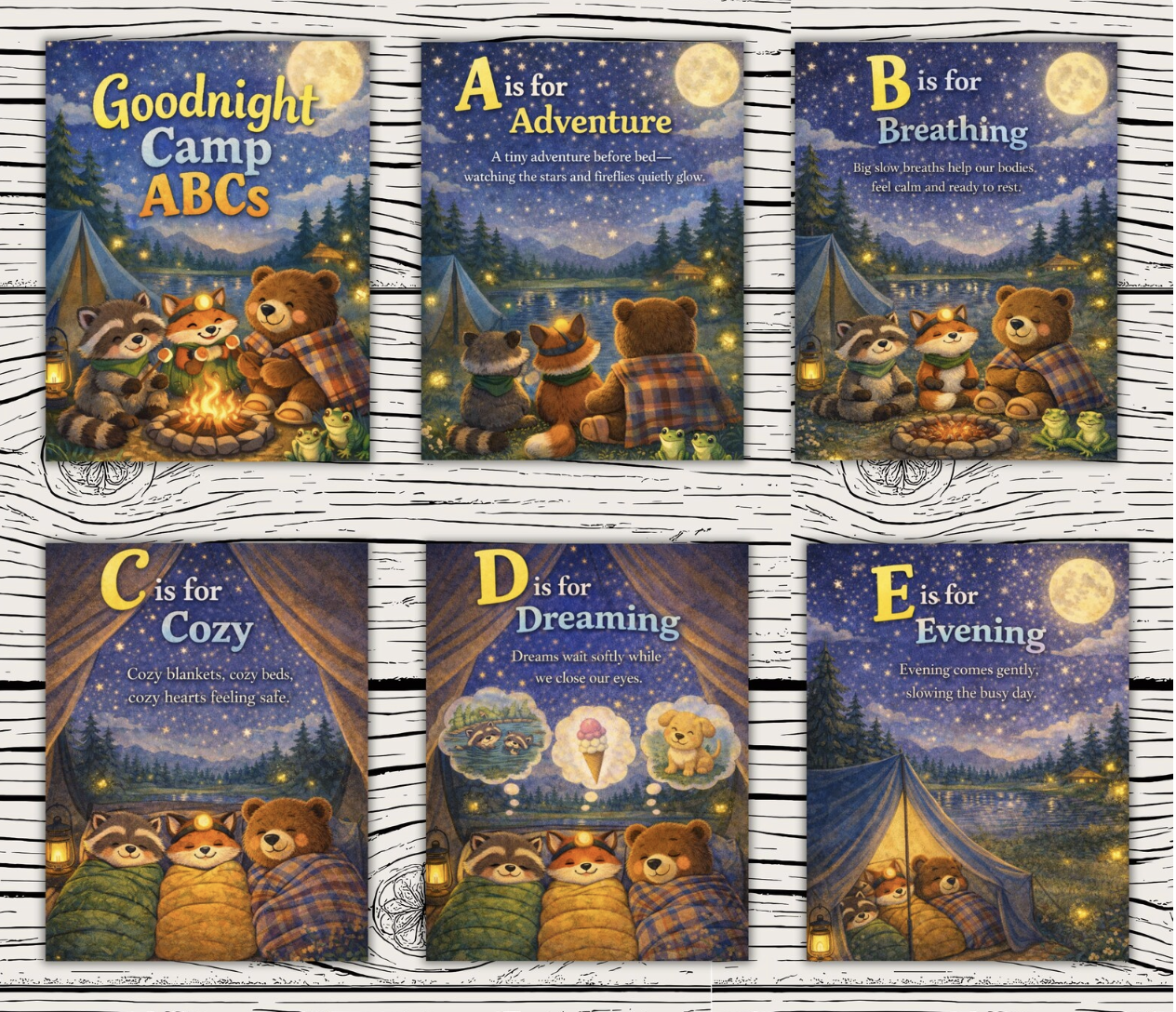 Whether read on a tablet or printed at home, Goodnight Camp ABC works as a gentle parenting bedtime book, an SEL-friendly read-aloud, and a meaningful nightly ritual. It’s more than an ABC book—it’s a cozy way to help children feel calm, connected, and ready for rest.