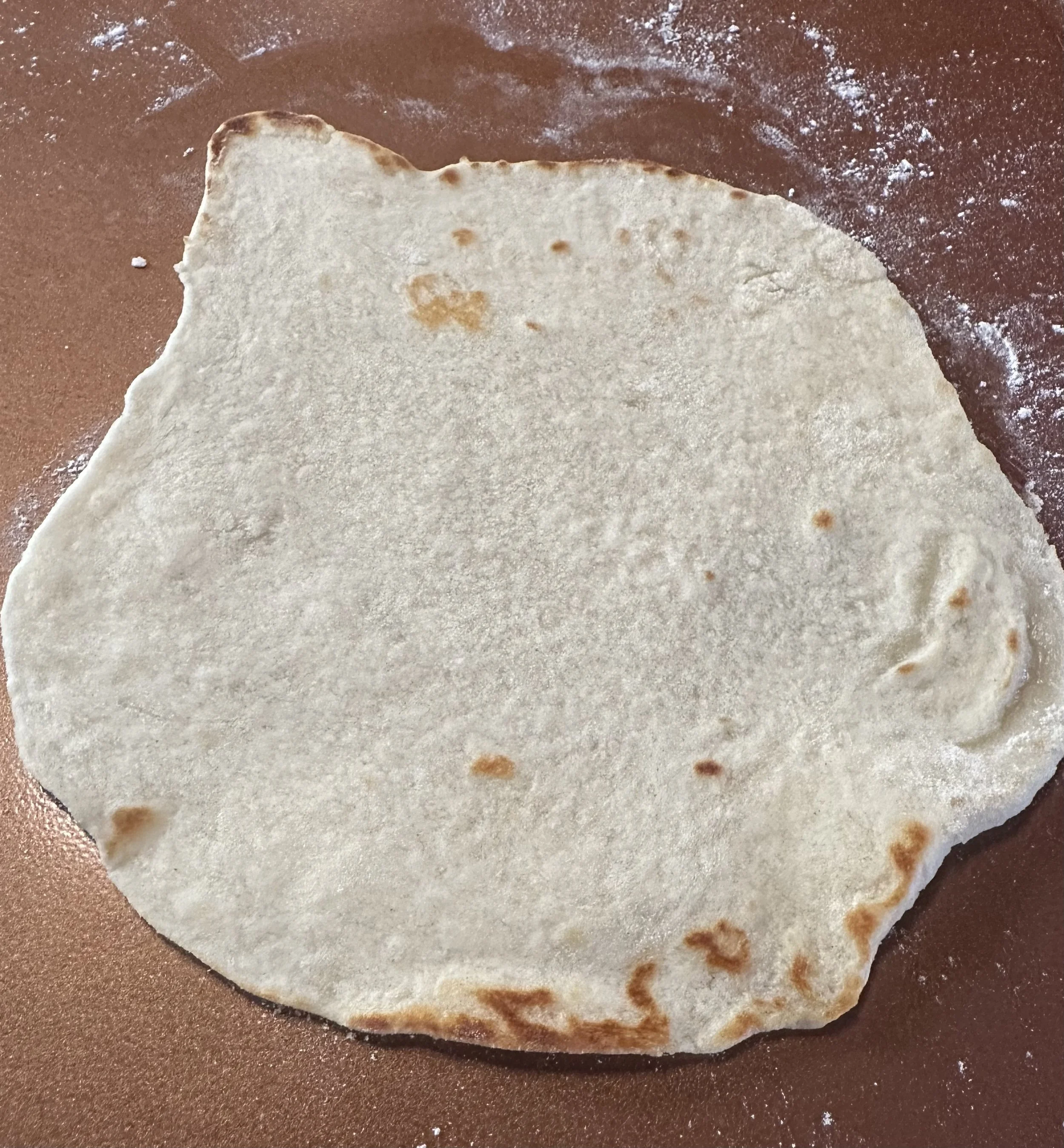 Sprinkle about 1/4 cup of flour onto the counter. Portion one heaping tablespoon of dough (I use my medium sized cookie scoop) onto the flour. Sprinkle the top liberally with more flour and roll into an 5 to 8 inch tortilla sized shape, about 1/8th inch thick.